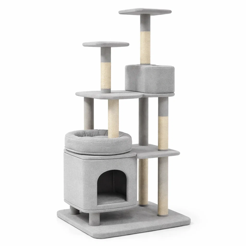 Der Kratzbaum ist aus weichem Polyesterplüsch gefertigt. Die Säulen sind mit strapazierfähigem Sisalseil umwickelt, ideal zum Kratzen und Klettern. Die Basis besteht aus MDF-Holz und sorgt für eine stabile Struktur im Innenbereich.