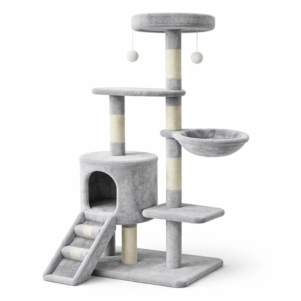 Der Baum verfügt über verschiedene Plattformen, eine Hängematte, eine Höhle und eine Leiter für Katzen. Die Sisalsäulen sind ideal zum Krallenschärfen.