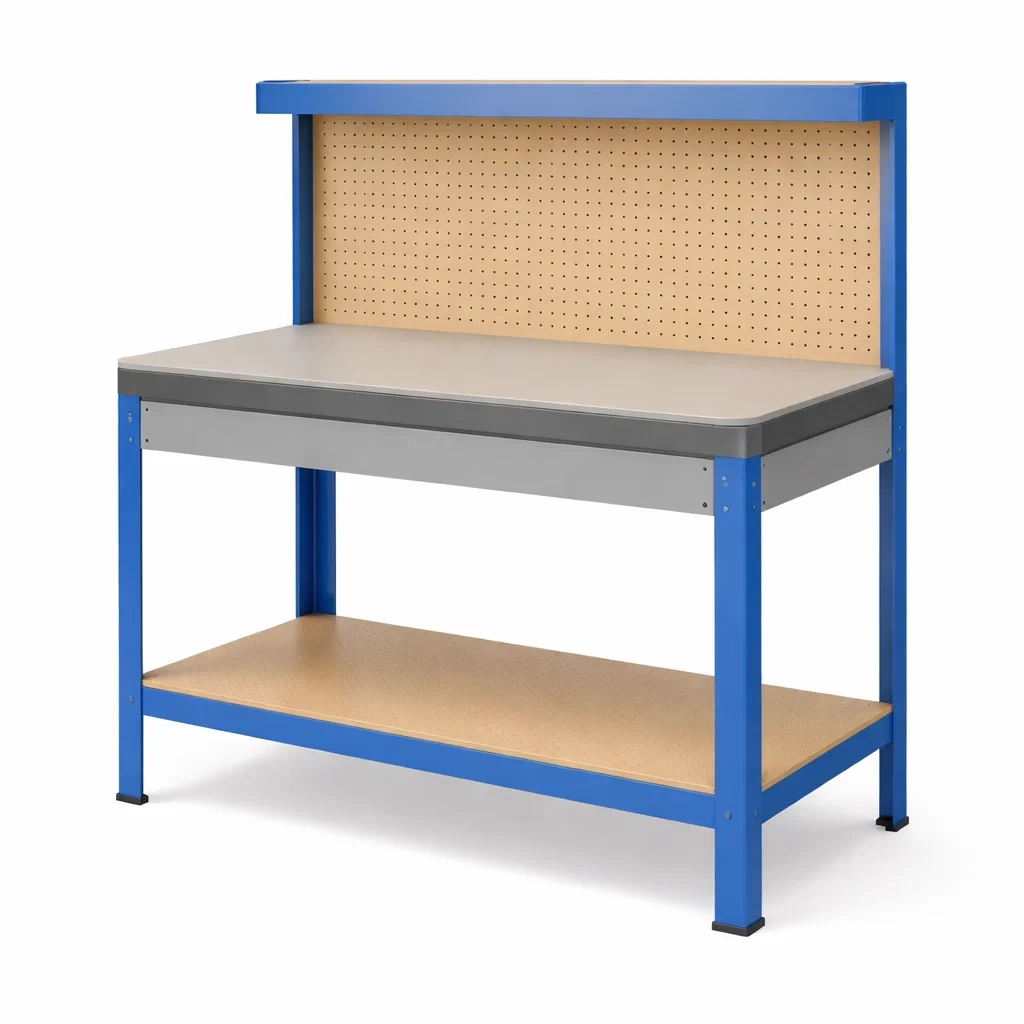 Die Werkbank besteht aus einem stabilen Rahmen aus Stahl. Die Arbeitsfläche ist aus Spanplatte mit einer Laminatbeschichtung gefertigt. Die untere Ablage besteht ebenfalls aus Spanplatte.